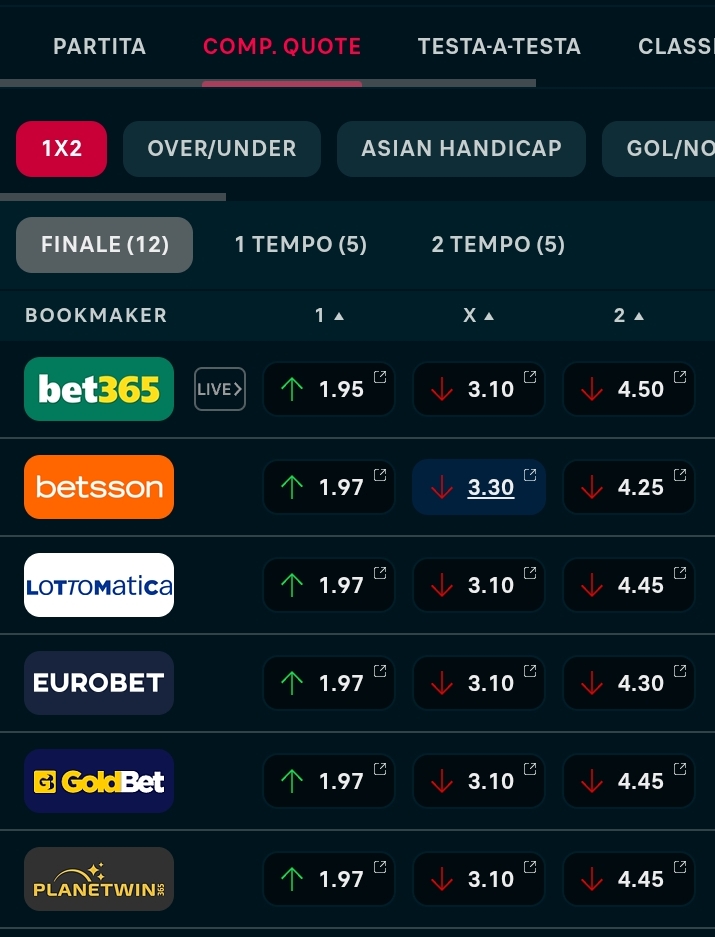 Scopri i migliori pronostici sportivi aggiornati, pensati per aiutarti a piazzare scommesse vincenti. Ogni evento sportivo nasconde un'occasione: che si tratti di calcio, tennis, basket o altri sport, qui trovi pronostici di oggi e domani analizzati nei dettagli per guidarti schedine e risultati vincenti. Le nostre previsioni si basano su dati concreti, andamento delle quote e valutazioni tecniche, con l'obiettivo di offrirti scommesse vincenti su base quotidiana. Studiamo ogni match con metodo, per proporti una visione chiara e affidabile su cosa giocare. Se cerchi pronostici vincenti,sei nel posto giusto!